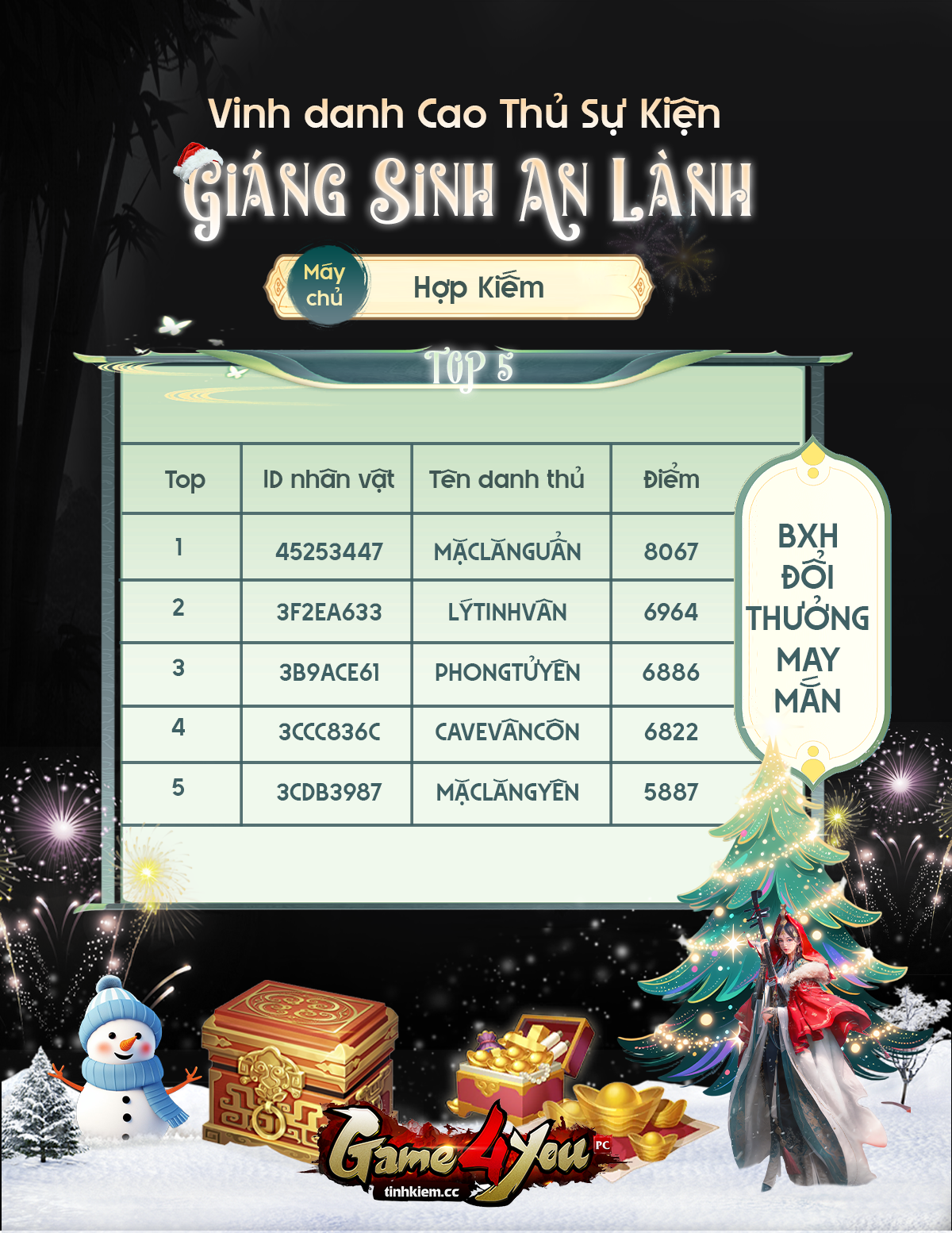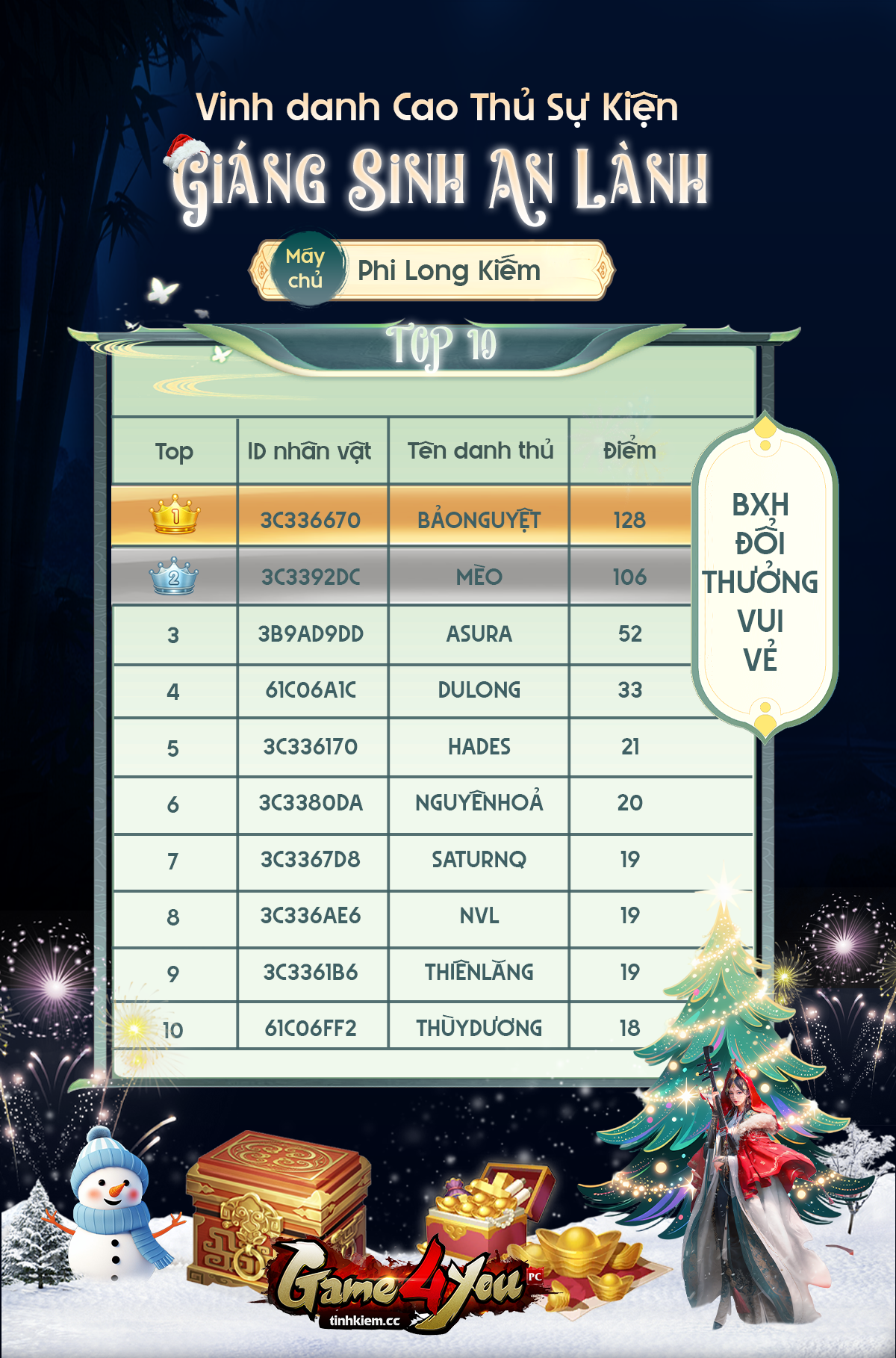 Sự kiện Giáng Sinh An Lành 2025 đã chính thức khép lại sau những ngày tranh tài sôi nổi. Từ các mốc ghi nhận BXH tạm thời (30/12 và 03/01/2026), cuộc đua vẫn liên tục biến động, nhiều danh thủ bám sát điểm số đến phút cuối, tạo nên một mùa lễ hội vừa rộn ràng vừa “căng não” đúng chất Thiên Long Tình Kiếm.