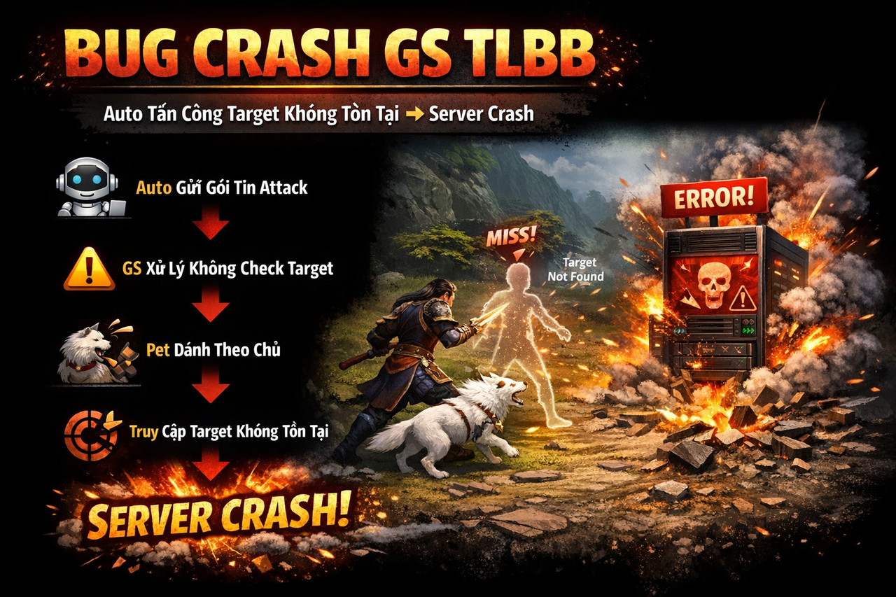 Trong quá trình vận hành và hỗ trợ nhiều máy chủ TLBB private, có một lỗi crash GS xuất hiện lặp đi lặp lại, đặc biệt ở các server cho phép hoặc không kiểm soát chặt việc sử dụng auto. Đây là một lỗi không mới, nhưng vẫn thường xuyên bị bỏ sót trong quá trình kiểm tra GS.