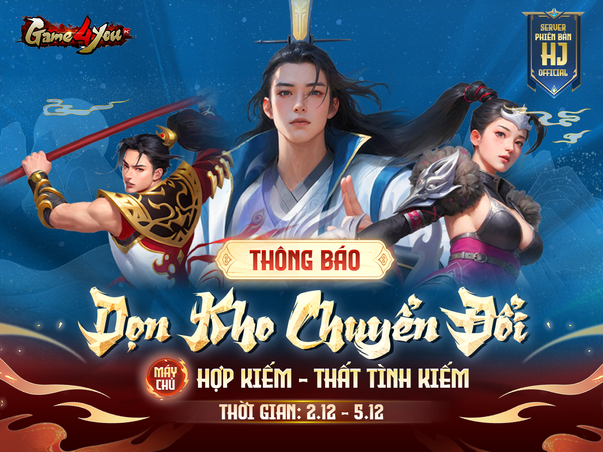 Để chuẩn bị cho đợt chuyển đổi phiên bản HJ Official sắp tới, bổn môn Thiên Long Tình Kiếm thông báo đến toàn thể người chơi tại hai máy chủ Hợp Kiếm và Thất Tình Kiếm về việc tiến hành dọn Kho Chuyển Đổi.